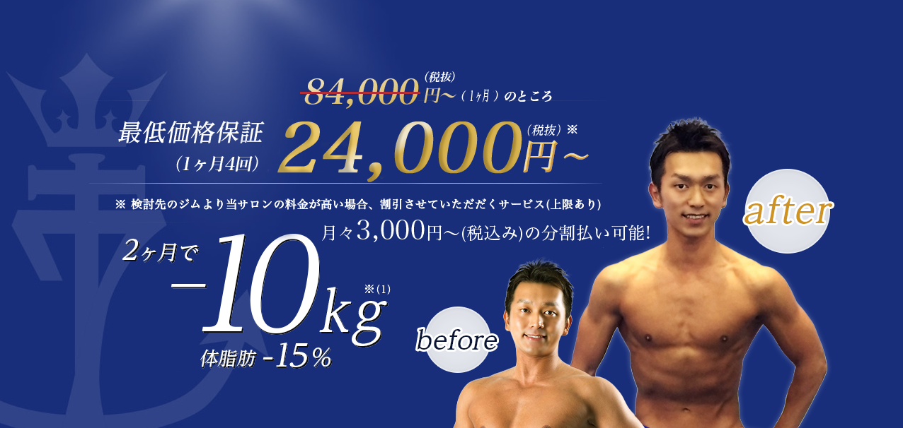 | 回数/期間 | 2か月コース 40分×8回 / 4か月コース 40分×16回 / 8か月コース 40分×32回のパーソナルトレーニング |